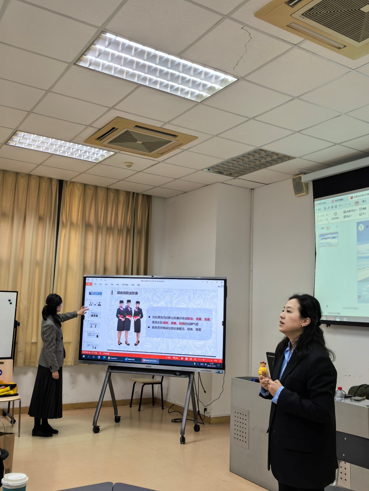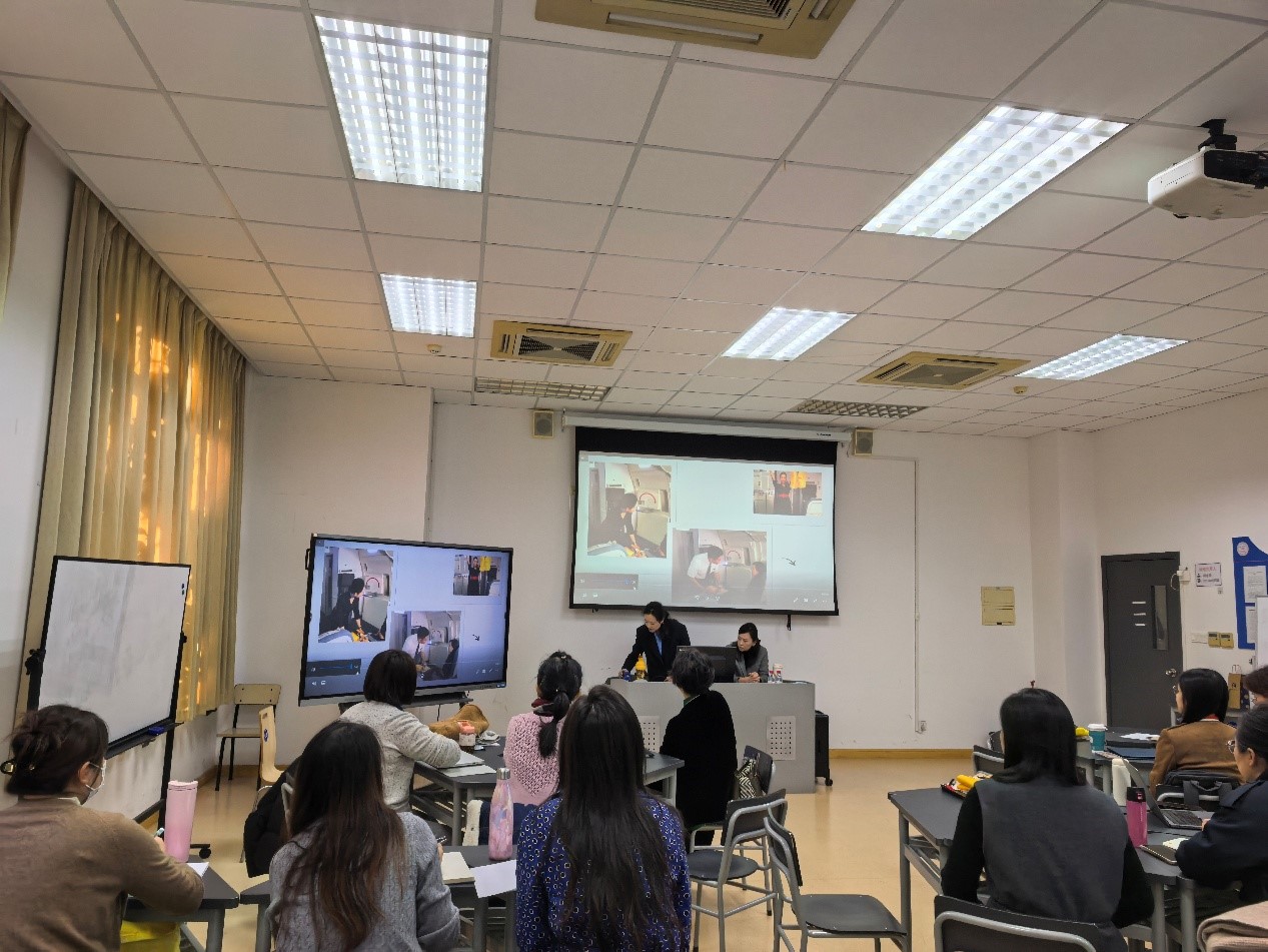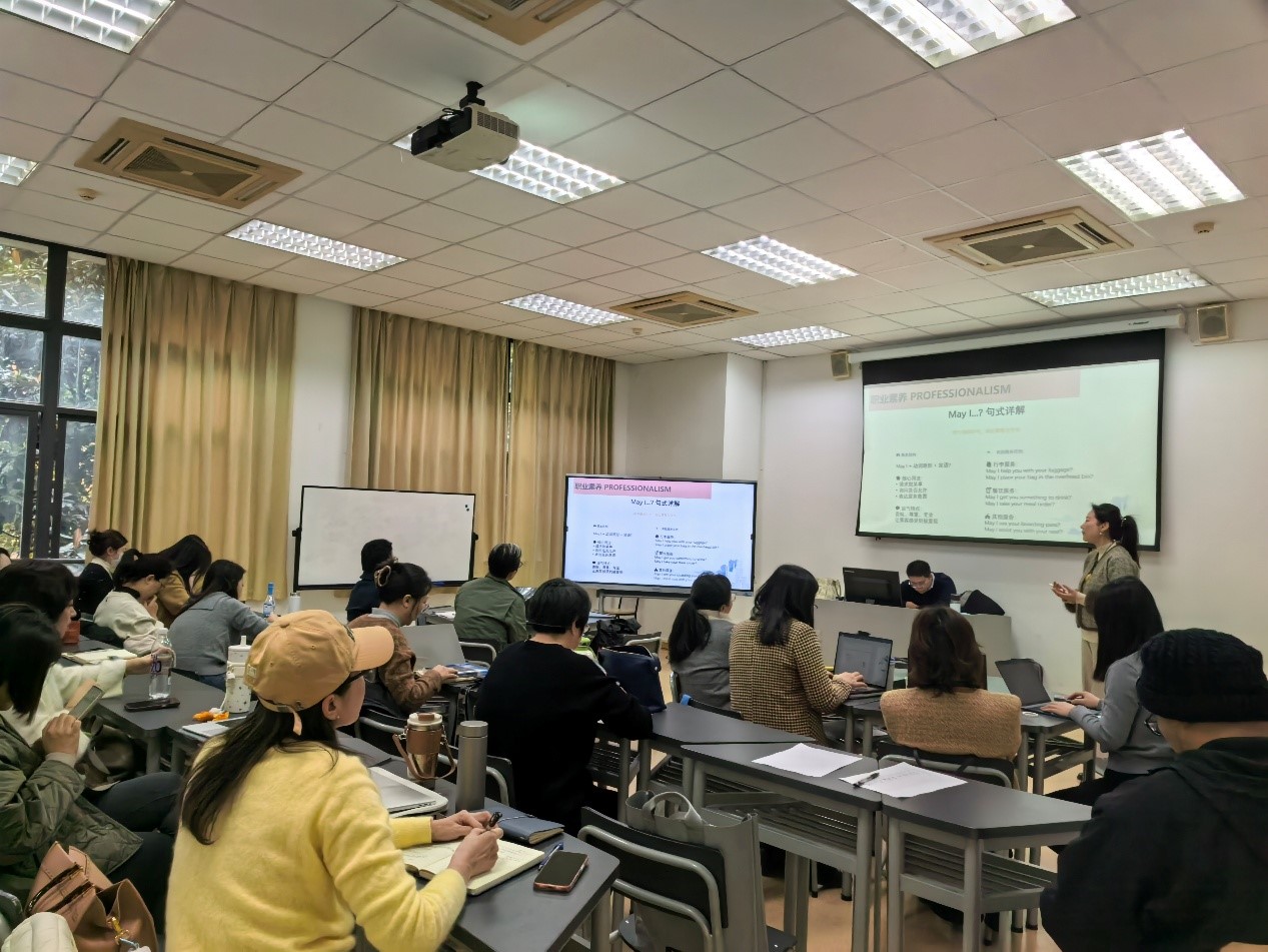 12月5日及12月12日,以提升校内教师教学与实践指导能力为核心,连续开展两天TTT多场专项课程。东航研发特派资深培训教员,内容涵盖“客舱服务英语”“乘务英语(须知简介、简令纸和广播词)”“客舱安全设备演示与机上规范动作”以及“乘务礼仪(含绅士礼仪)”等模块。将东航在乘务英语、安全规范、仪态管理等方面的最新标准与评价体系系统导入。郝姚丹、高锋、陈丽丽、苏佳、吴江华、施元麟、姜明、王维等近三十位骨干教师积极参与,与企业教员共同学习、研讨。课程强调东航培训标准需求,帮助教师深入理解行业最新标准与教学要点,为高质量开展订单班教学奠定了坚实基础。第一阶段TTT课程不仅是一次内容的转授,更是教学理念与行业认知的双向更新,标志着我校在“双师型”教学团队建设与课程体系共建方面迈出了实质性的一步。
