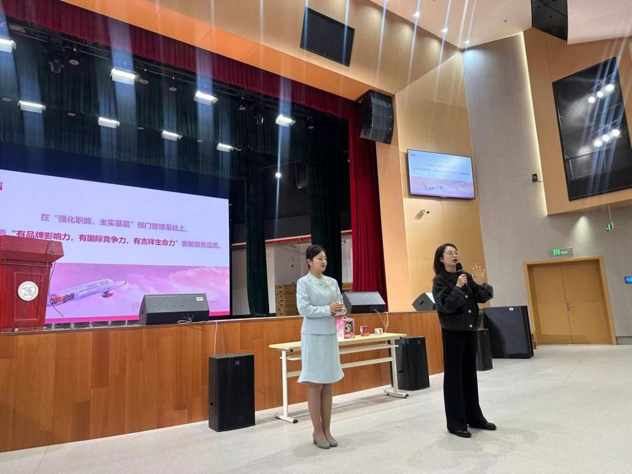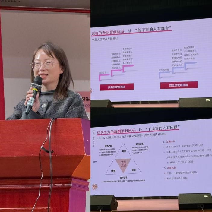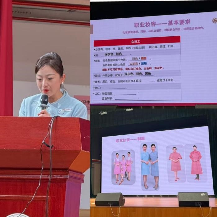 吉祥航空客舱部夏经理向同学们阐述了公司的人文关怀和福利保障体系。从入职团建到月度生日会,从疫情期间“不降薪、不裁员”的坚定承诺,到涵盖人才公寓、餐食补贴、落户支持等全方位福利保障,展现了公司对员工切身利益的真诚关怀。夏经理还特别介绍了兼具美观与实用的公司制服,以及彰显专业与个性的精致妆容要求,激发同学们对未来职业形象的向往。
