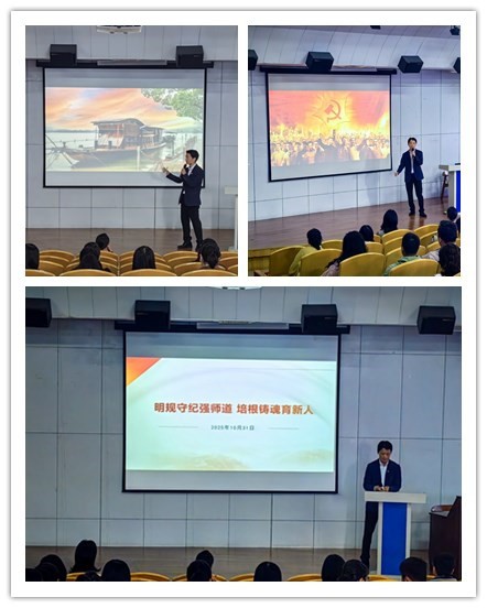 随后,马克思主义学院姜碧纯老师作了题为《明规守纪强师道 培根铸魂育新人》的主题宣讲,他从理论高度与实践维度深入阐释纪律规矩的重要性,结合丰富生动的典型案例,将“大理论”转化为“小切口”,对《中国共产党纪律处分条例》进行了详尽地解读,让大家更加清楚地明白了党的纪律规矩是什么,能做什么,不能做什么,彻底扫清党纪“盲区”,远离“禁区”、避开“雷区”。