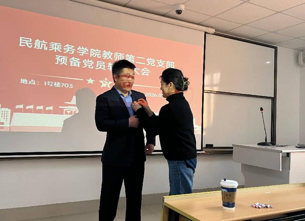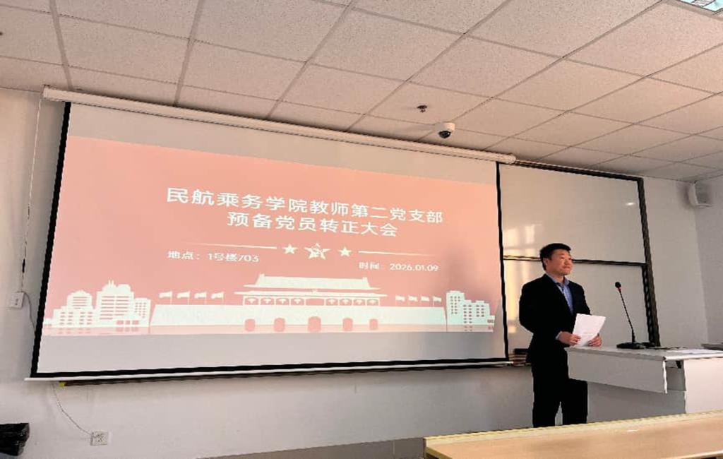 2026年1月9日,民航乘务学院党总支第二教师党支部在徐汇校区1号楼703教室召开预备党员转正大会,讨论并表决于威同志按期转正事宜。支部全体党员、入党介绍人等参会,会议由支部书记邱珂主持。